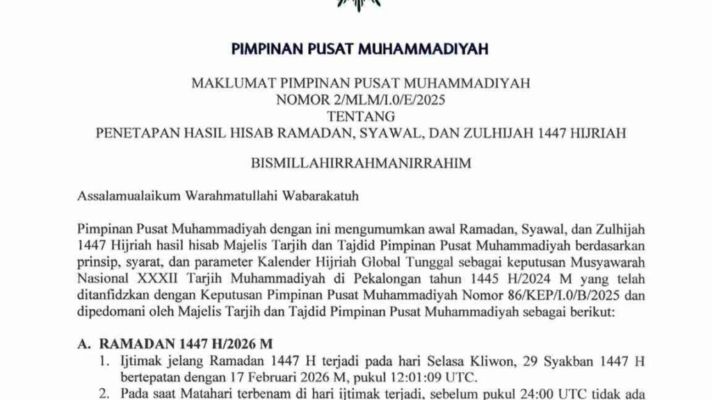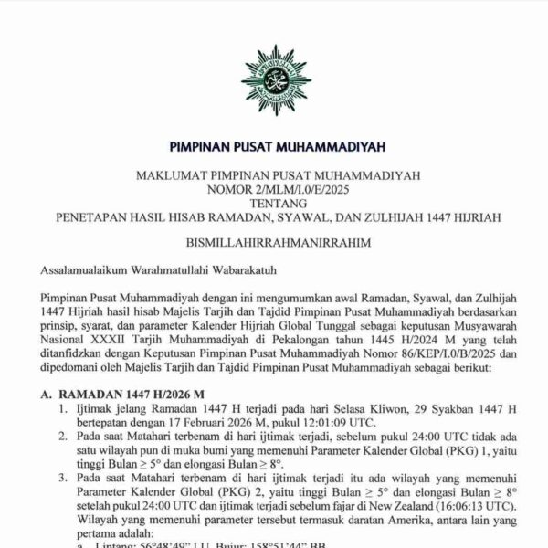 KUNINGAN (MASS) – Pimpinan Pusat Muhammadiyah telah mengeluarkan maklumat mengenai penetapan awal Ramadan 1447 Hijriah pada Rabu 18 Februari 2026. Menurut keputusan ini, umat...