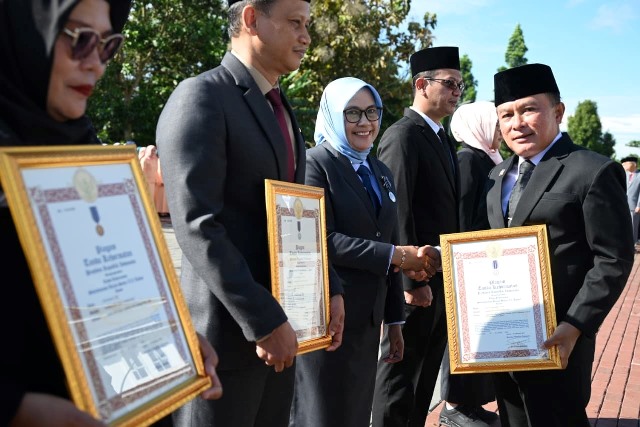 KUNINGAN (MASS) – Sebanyak 112 orang ASN Kabupaten Kuningan menerima tanda jasa Satyalancana Karya Satya dari Presiden Republik Indonseia yang diserahkan Bupati Kuningan Dr H Dian Rachmat Yanuar M Si, Rabu (1/10/2025). Penghargaan tersebut diberikan pada para ASN yang mengabdi dalam jangka waktu tertentu.