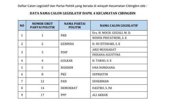Berikut data nama calon legislatif Kecamatan Cibingbin: