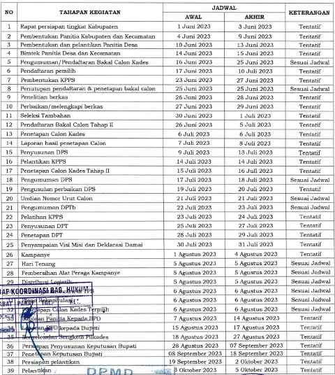 Jadwal dan tahapan Pilkades itu, sesuai dengan Keputusan Bupati no: 141/KPTS.367-DPMD/2023 tentang Penetapan Tahapan, Jadwal Pelaksanaan dan Desa Yang Akan Mengikuti Pemilihan Kepala Desa Serentak Di Kabupaten Kuningan.
