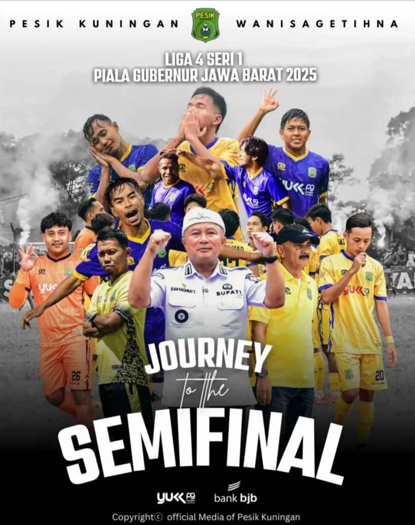 KUNINGAN (MASS) – Beberapa hari lalu, tim sepak bola Pesik Kuningan memastikan diri lolos ke babak semifinal Liga 4 Seri 1 Piala Gubernur Jawa Barat tahun 2025. Kabar gembira ini langsung menjadi perbincangan hangat di kalangan masyarakat pecinta sepak bola di Kabupaten Kuningan, terutama setelah diunggah di akun Instagram resmi Pesik Kuningan. Unggahan tersebut menampilkan foto Bupati Kuningan yang tampak besar dan dominan, memicu berbagai pertanyaan dari para penggemar.