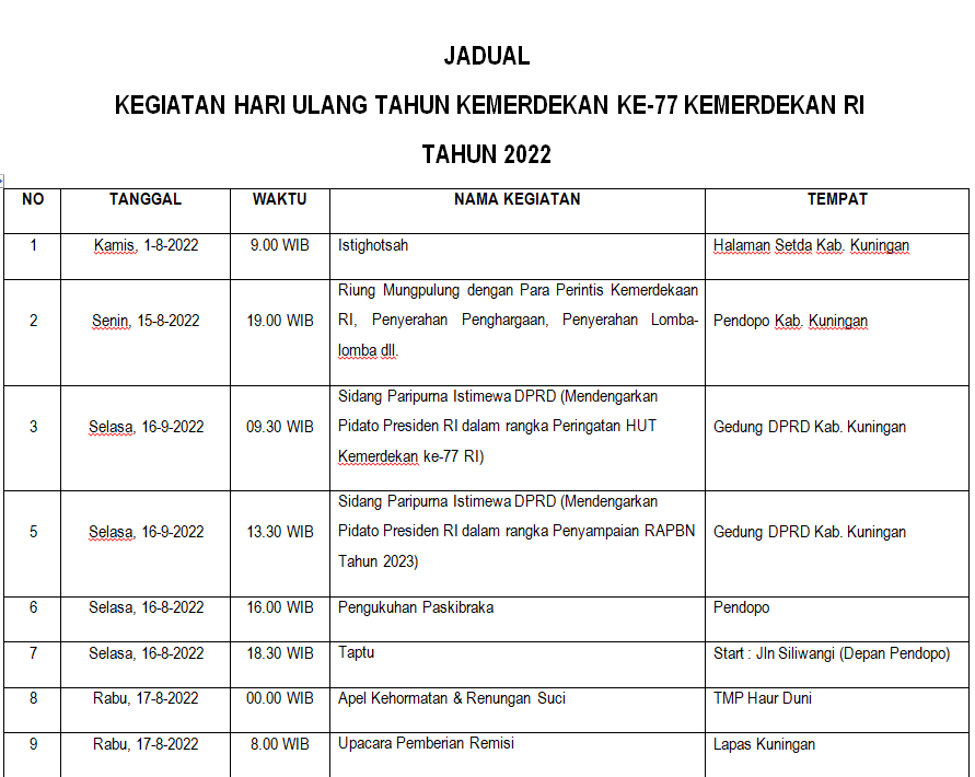 Dari jadwal yang diterima kuninganmass.com, dengan tertanda ketua dan sekertaris PHBN Drs Nurahim serta Deni Komara S IP, peringatan Agustusan ini sudah dimulai sejak awal bulan ini dengan acara istigosah.
