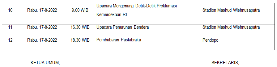 Pada hari H, Rabu (17/8/2022), akan digelar juga beberapa agenda. Selain kegiatan utama mengenang detik proklamasi dan penurunan bendera di Stadion Mashud, akan ada juga apel kehormatan dan renungan suci.