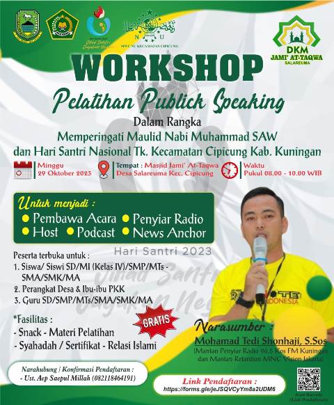 Kemudian ada Workshop pelatihan Publick Speaking untuk panduan menjadi pembawa acara/ MC, penyiar radio, host berita, podcast atau news anchor. Kegiatan ini diselenggarakan bekerja sama dengan DKM At-Taqwa Desa Salareuma Kecamatan Cipicung dan akan diselenggarakan pada hari Minggu pagi pukul 08.00 s/d selesai 29 Oktober 2023.