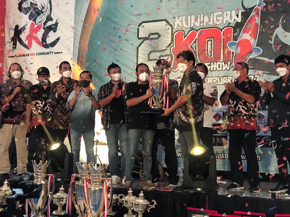 KUNINGAN (MASS) – Pada penutupan Kontes Ikan Koi bertajuk Kuningan Koi Show 2nd , Minggu (20/2/2022) tadi, juara di kelas Grand Champion diceburkan ke salah satu kolam di Gedung Olahraga Seni dan Budaya Ewangga – Kuningan. Selain juara, ketua panitia D Ferdiana juga ikut diceburkan oleh panitia.