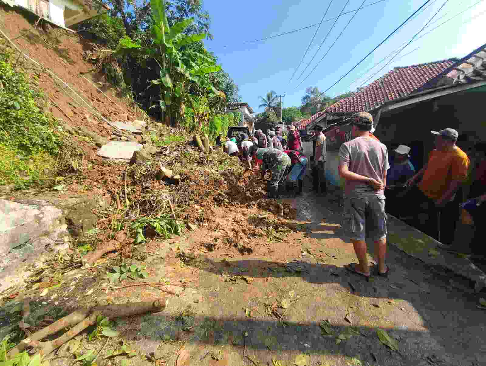 Sebanyak 50 warga bergabung dengan Babinsa Cileuya, Koptu Agung Indra, serta Kepala Dusun Calingcing dalam kegiatan pembersihan material longsor, Senin (23/3/2026).