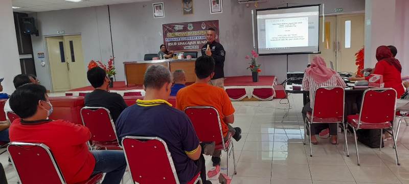 Kepala UPT Damkar M Khadafi Mufti SPd MSi, pemateri, memaparkan tentang standarisasi sistem proteksi kebakaran aktif yang pasif di lingkungan RSUD Linggarjati Kuningan.
