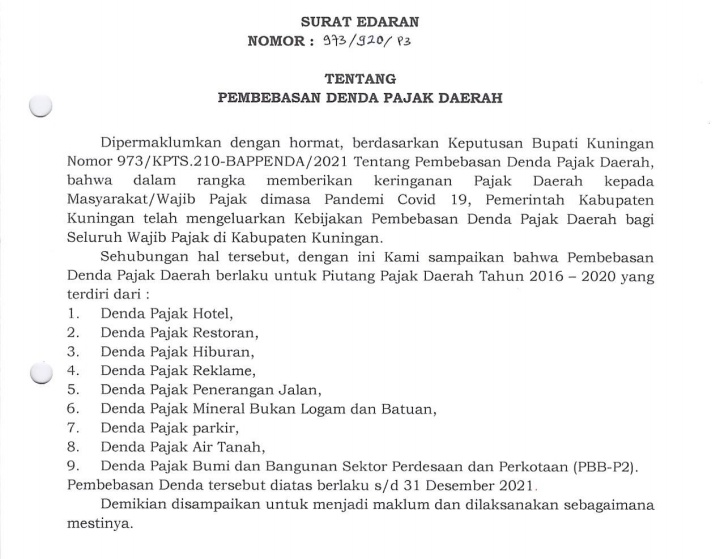 KUNINGAN (MASS) – Untuk meringankan beban wajib pajak, terlebih saat ini tengah pandemi, Pemkab Kuningan melakukan penghapusan denda pajak.