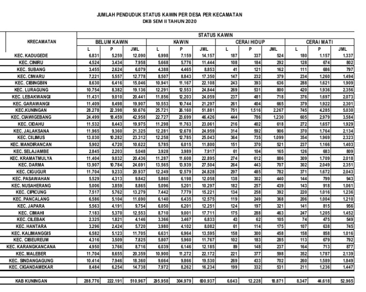 Kemudin, untuk cerai mati laki-laki 8.347 dan perempuan 44.618. Dengan data seperti ini maka jumlah janda di Kuningan lebih banyak atau mencapai 56.856 orang. Sedangkan dudanya total 14.990.