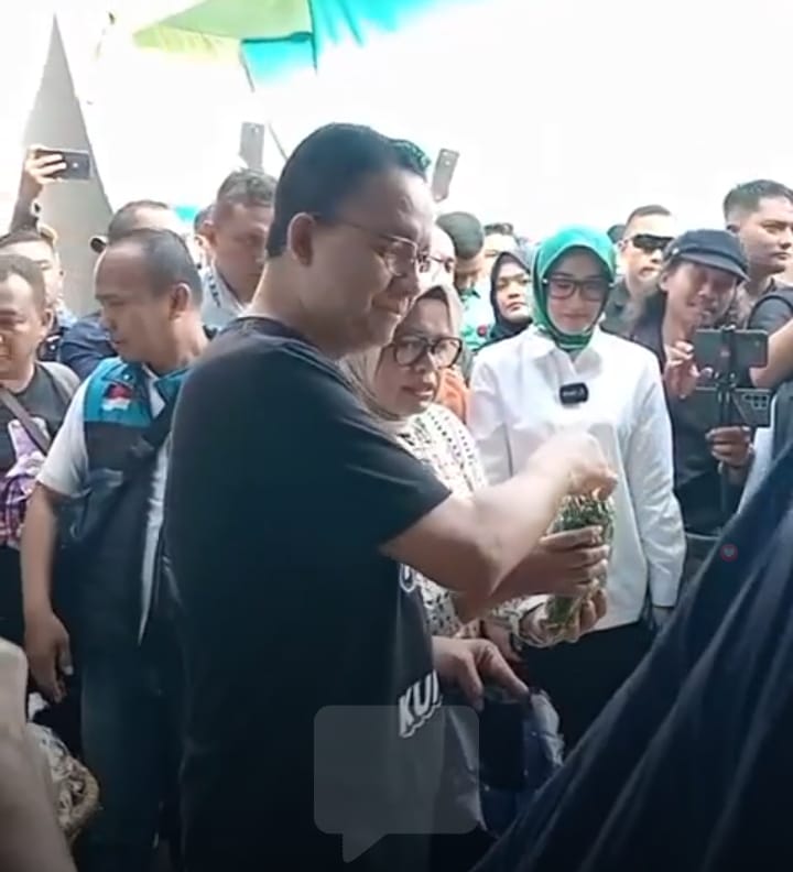 Saat di Pasar, Anies bahkan berbelanja di beberapa pedagang. Anies membeli cabe dan leunca serta daging.