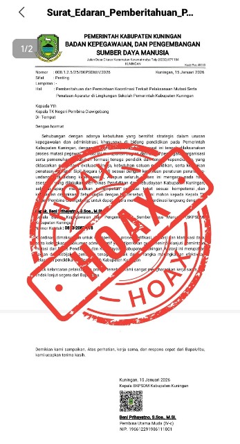 Menanggapi, Kepala Badan Kepegawaian dan Pengembangan Sumber Daya Manusia (BKPSDM) Kabupaten Kuningan, Beni Prihayatno, S.Sos., M.Si., melalui Kepala Bidang Informasi dan Komunikasi Publik Diskominfo Kabupaten Kuningan, menegaskan bahwa BKPSDM tidak pernah mengeluarkan surat dimaksud. Sabtu (17/1/2026).