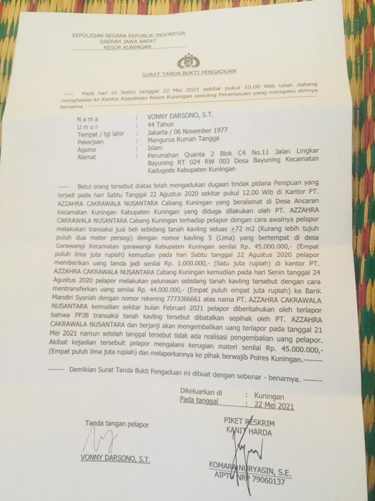 Setelah lewat tenggat waktu dua kali, dan sudah datang juga ke kantor utamanya di Cirebon, uang Vonny belum juga kembali. Saat itulah, kisaran tanggal 22 Mei 2021 dirinya melapor ke Polres Kuningan, dan dikeluarkan Surat Tanda Bukti Pengaduan oleh Kanit Harda Komara Nuryadin SE.