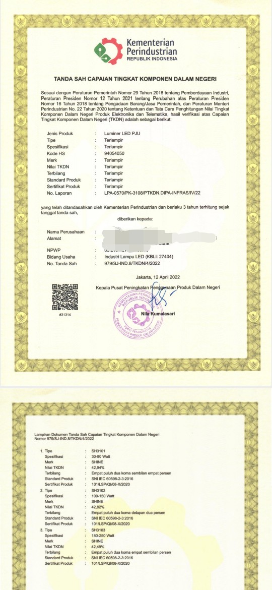 Dalam surat dokumen yang dikeluarkan oleh Kementrian Perindustrian Republik indonesia tentang tanda sah capaian tingkat komponen dalam negeri (TKDN) bahwa perusahaan pemenang lelang tercatat tipe SH3101 dengan spesifkasi 30-80 watt merk SHINE nilai TKDNnya hanya 42,94 %.