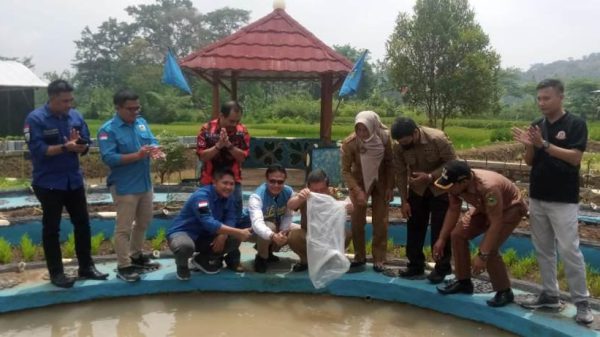KUNINGAN (MASS) – Bupati Kuningan, H Acep Purnama secara simbolis menebarkan benih ikan di Bendungan Kuningan, Desa Cibeureum, Kecamatan Cibeureum, Selasa (13/7/2021).