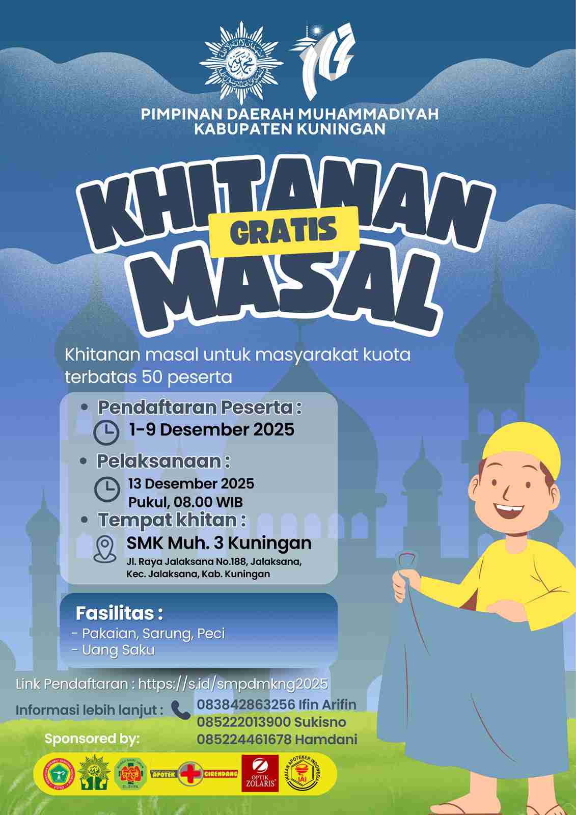KUNINGAN (MASS) – Pimpinan Daerah Muhammadiyah (PDM) Kabupaten Kuningan menggelar Khitanan Massal Gratis dalam rangka Milad Muhammadiyah ke-113. Kegiatan ini menyediakan kuota 50 peserta dan dijadwalkan berlangsung pada 13 Desember 2025 pukul 08.00 WIB di SMK Muhammadiyah 3 Kuningan.