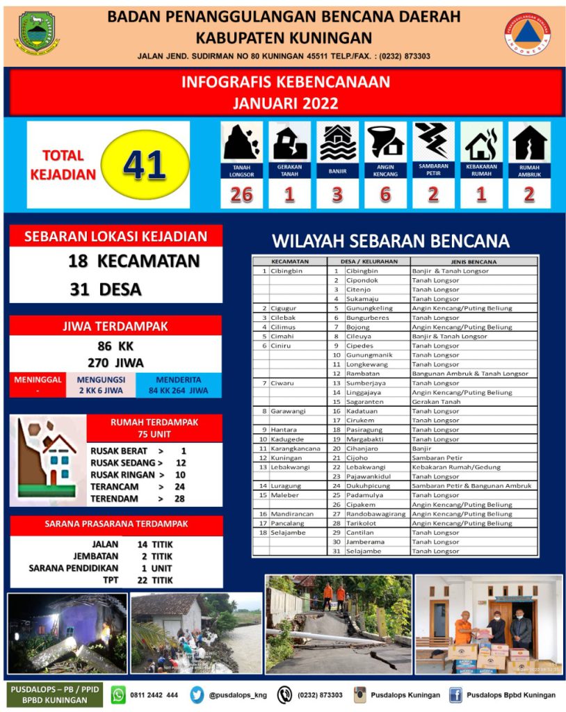 KUNINGAN (MASS)- Untuk Januari BPBD Kuningan mencatata terjadi 41 kali bencana. Jumlah tersebut terjadi di 31 desa yang berada du 18 kecamatan.