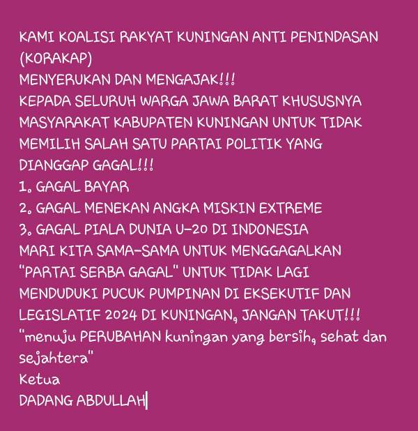 KUNINGAN (MASS) – Mantan Ketua Hanura Kuningan Dadang Abdullah membuat ajakan untuk tidak memilih partai serba gagal. Dalam ajakannya, Dadang mengatasnamakan diri sebagai KORAKAP (Koalisi Rakyat Kuningan Anti Penindasan).