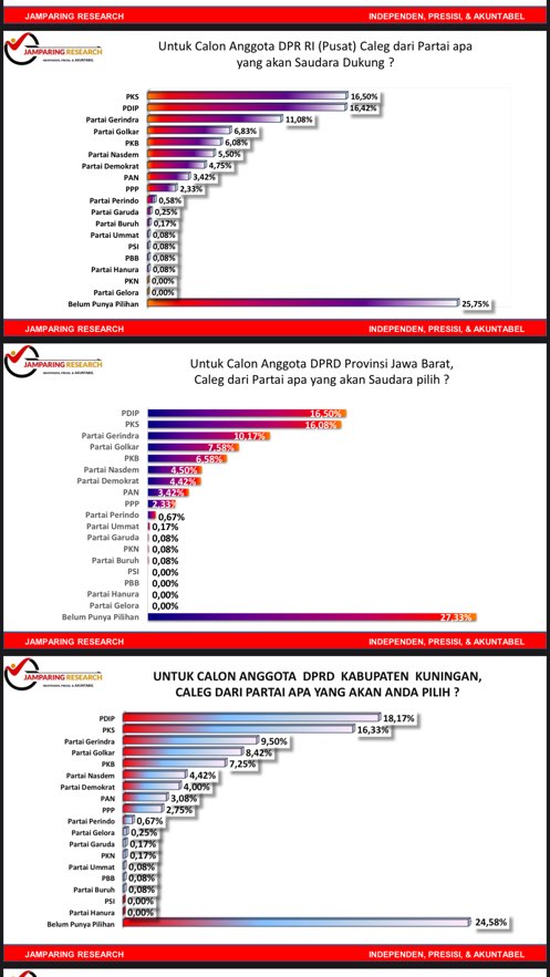 Hal itu, tergambar dari hasil survey Jamparing Research (JR) untuk Pileg baik di tingkat DPR RI, DPRD Jawa Barat, dan DPRD Kabupaten kuningan, yang dirilis baru-baru ini.