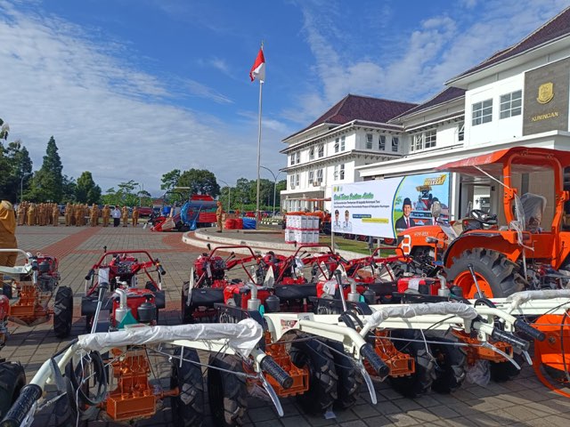 Bupati Kuningan, Dr Dian Rachmat Yanuar M Si, secara langsung menyerahkan simbolis sejumlah unit mesin pertanian kepada perwakilan kelompok tani. Bantuan tersebut merupakan program dari Kementerian Pertanian Republik Indonesia dalam rangka percepatan swasembada pangan di Kabupaten Kuningan.