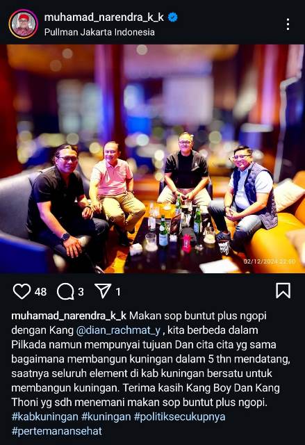 “Makan sop buntut plus ngopi dengan Kang @dian_rachmat_y , kita berbeda dalam Pilkada namun mempunyai tujuan Dan cita cita yg sama bagaimana membangun Kuningan dalam 5 thn mendatang, saatnya seluruh element di kab kuningan bersatu untuk membangun Kuningan. Terima kasih Kang Boy Dan Kang Thoni yg sdh menemani makan sop buntut plus ngopi.” begitu tertulis di caption @ muhamad_narendra_k_k.