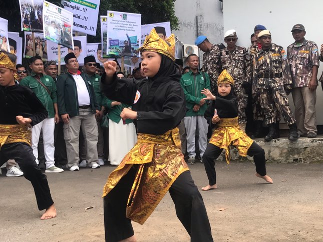 Bukan hanya itu, kedatangan Bacaleg PKB juga sangat nyentrik. Dipertontonkan, aksi pencak silat oleh anak-anak. Mereka, dengan lihai memainkan golok dan kipas dalam aksinya. Bahkan, dipertontonkan aksi pertarungan yang atraktif.