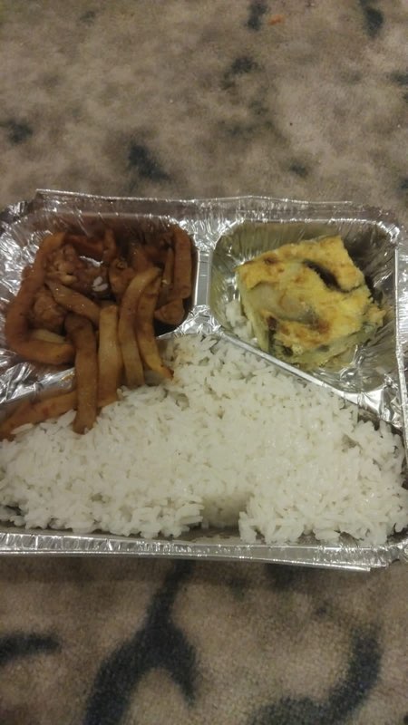 Makanannya, satu paket ada yang hanya berisi nasi kuning dan sedikit potongan telur dadar. Paket lainnya, ada yang berisi nasi putih.