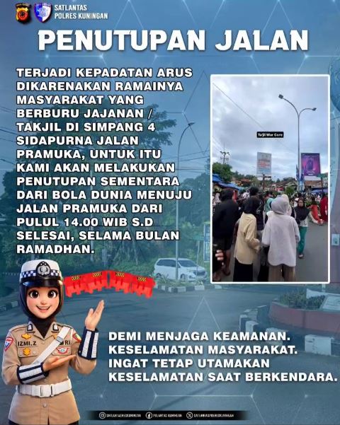 KUNINGAN (MASS) – Sudah menjadi tradisi setiap ramadhan dibeberapa titik ruas jalan di Kuningan sering mengalami kepadatan arus, terutama di sekitar Simpang 4 Sidapurna Jalan Pramuka. Ini disebabkan oleh banyaknya masyarakat yang berburu jajanan atau takjil untuk berbuka puasa. Dalam rangka menjaga ketertiban dan keamanan, pihak kepolisian mengambil langkah tegas dengan melakukan penutupan sementara.