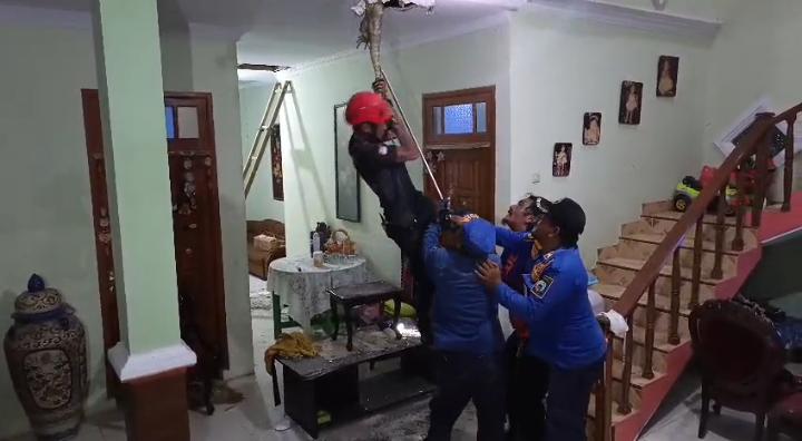 “Saat evakuasi berlangsung Anggota harus membuka atap plafon rumah di beberapa titik untuk memudahkan menangkap biyawak karena selalu berpindah tempat,” tuturnya.