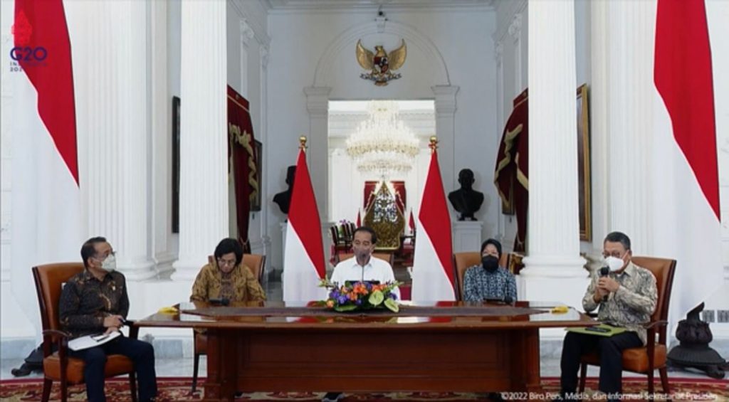 Didampingi Mentri Sekertarian Negara Pratikno, Mentri Keuangan Sri Mulyani, Mentri Sosial Tri Rismaharini, dan Mentri ESDM Arifin Tasrif, Presiden mengumumkan kenaikan harga BBM.