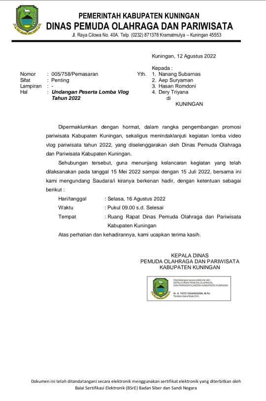 - Kami menghargai Disporapar Kuningan yang telah membuat terobosan program untuk promosi destinasi wisata melalui lomba vlog ini. Namun kami pun sebagai peserta merasa punya hak untuk dihargai hasil karya kami, terutama dengan keputusan panitia yang adil dan profesional.
