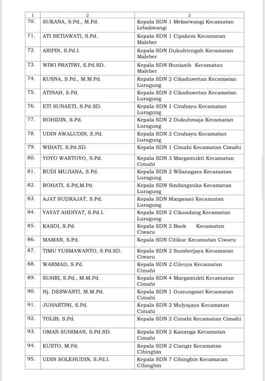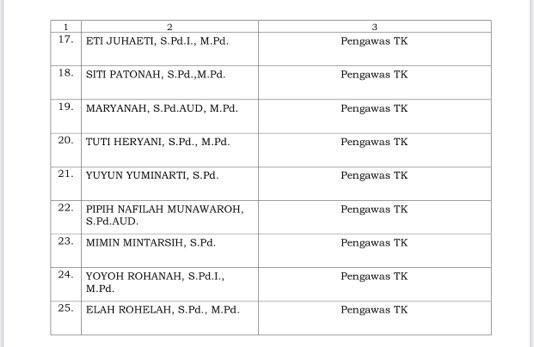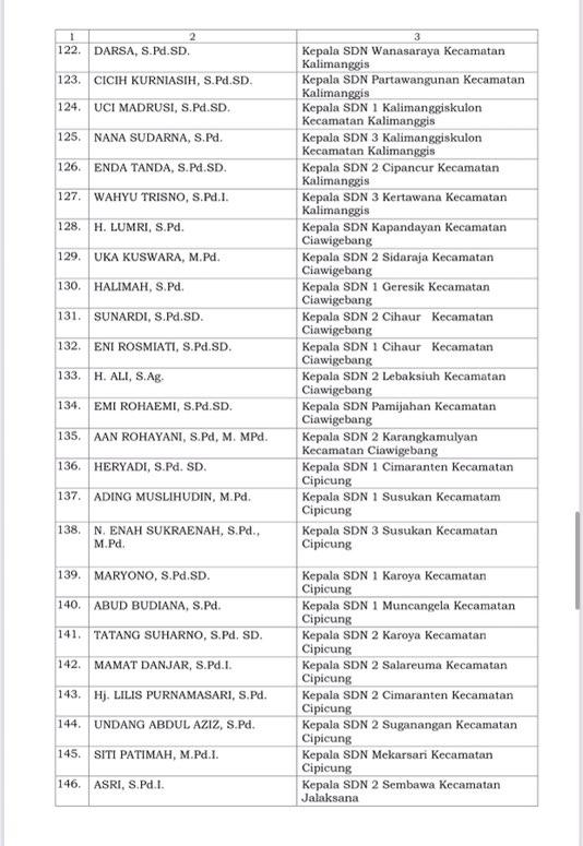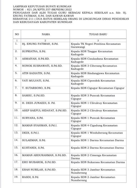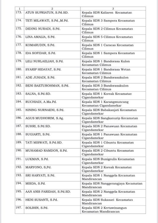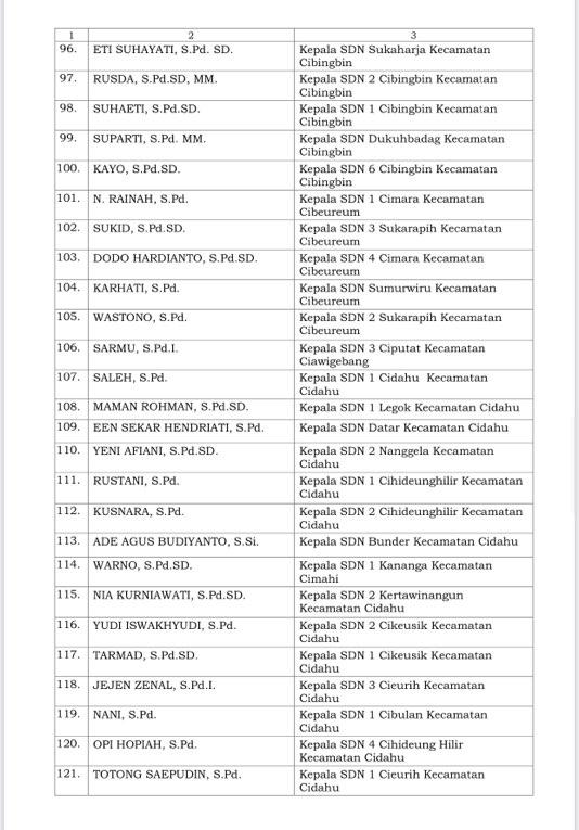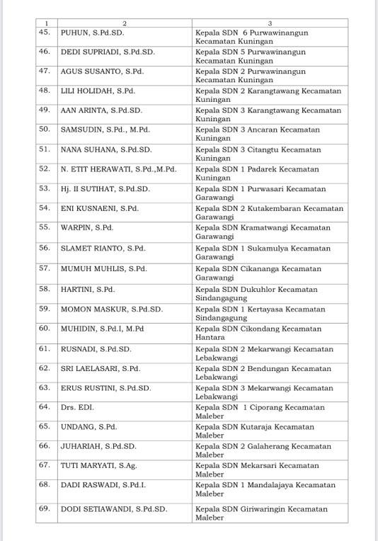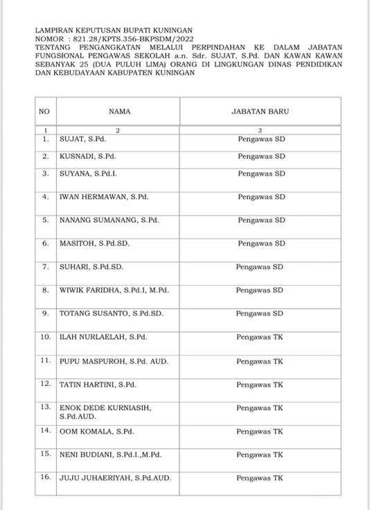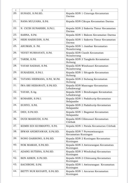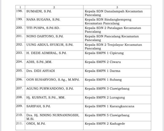 Berikut, daftar nama dan jabatan Kepala Sekolah, Pengawas dan Jabatan Fungsional TK, SD, dan SMP Negri se-Kabupaten Kuningan :