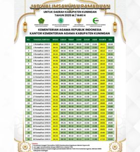 KUNINGAN (MASS) – Kantor Kementrian Agama (Kemenag) Kabupaten Kuningan merilis jadwal imsakiyah, buka puasa serta waktu shalat selama bulan Ramadhan 1446 H/2025 M untuk wilayah Kabupaten Kuningan.