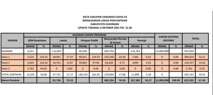 Sebagai bahan informasi tabel dibawah ini adalah menunjujkan data cakupan vaksinasi berdasarkan lokasi penyuntikan kabupaten Kuningan update tanggal 4 oktober 2021.