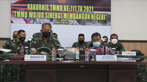 KUNINGAN (Mass) – Rangkaian TNI Manunggal Membangun Desa (TMMD) ke 98 di Desa Sindang Kecamatan Lebakwangi Kuningan diisi pula dengan kegiatan sosialisasi bahaya Narkoba di balai desa setempat kemarin, (3/5). Penyuluhan dilakukan langsung oleh tim Wasev Mabes TNI yakni Mayor Inf Untung SIP didampingi Kasdim 0615 Kuningan Mayor Inf Riza Taufik Hasan SIP.
