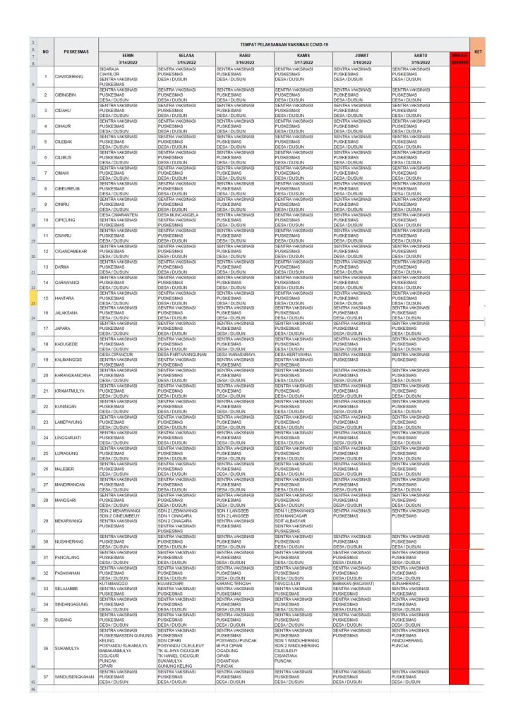 KUNINGAN (MASS) – Berikut adalah jadwal vaksinasi covid-19, Senin – Sabtu (14-19/3/2022) yang tersebar di kecamatan-kecamtan yang ada di Kabupaten Kuningan.