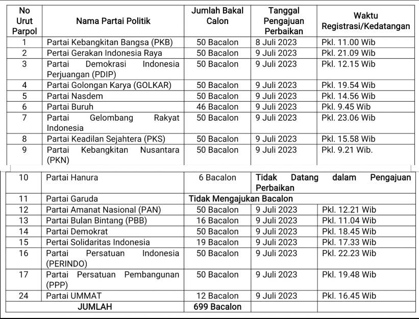 “Partai Politik Peserta Pemilu dapat melakukan perbaikan dalam hal dokumen persyaratan administrasi bakal calon dinyatakan belum benar. Lalu, bakal calon dinyatakan ganda dapat diajukan kembali dalam hal menyatakan memilih salah satu lembaga perwakilan, daerah pemilihan dan/atau partai politik peserta pemilu yang mengajukan. Bakal calon dinyatakan ganda dapat diganti dalam hal menyatakan tidak memilih lembaga perwakilan, daerah pemilihan dan/atau partai politik peserta pemilu yang mengajukan. Bakal calon diajukan pindah daerah pemilihan. Bakal calon mengundurkan diri. Bakal calon meninggal dunia; dan diganti berdasarkan persetujuan dari Ketua Umum Partai Politik Peserta Pemilu atau nama lainnya dan Sekretaris Jenderal Partai Politik Peserta Pemilu atau nama lain,” paparnya.