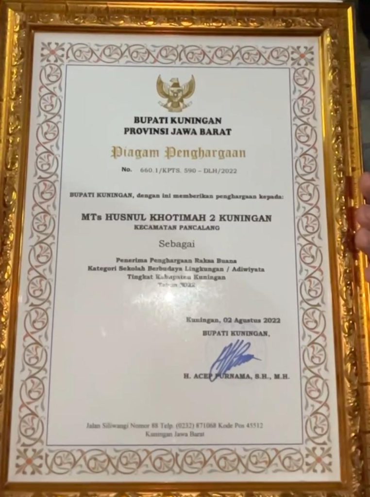 KUNINGAN (MASS) – MTs Husnul Khotimah 2 terpilih sebagai Penerima Piagam Penghargaan Sekolah Adiwiyata Kabupaten Kuningan tahun 2022. Penyerahan penghargaan Sekolah Adiwiyata dilakukan secara langsung oleh Bupati Kuningan, H. Acep Purnama, SH., MH. dalam acara Riung Mungpulung dalam rangka HUT ke-77 Kemerdekaan RI dan Hari Jadi Kabupaten Kuningan ke 524 di Halaman Setda Kabupaten Kuningan, Senin (15/8/2022).