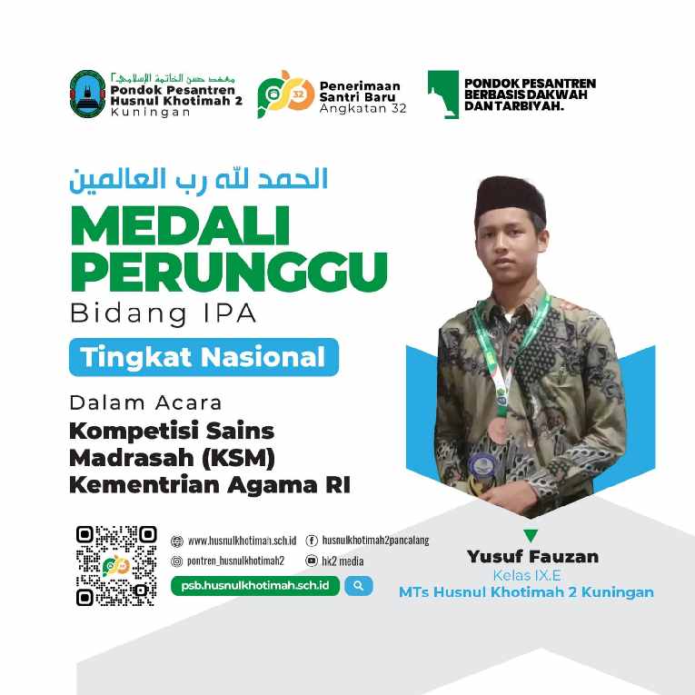 KUNINGAN (MASS) – Prestasi membanggakan diraih oleh Yusuf Fauzan, santri Pondok Pesantren Husnul Khotimah 2 Kuningan jenjang MTs berhasil meraih medali perunggu dalam ajang Kompetisi Sains Madrasah (KSM) tingkat nasional tahun 2024. Yusuf tampil cemerlang di bidang IPA Terpadu jenjang MTs/SMP dalam kompetisi yang diadakan di Kota Ternate, Maluku Utara pada tanggal 2-7 September 2024.