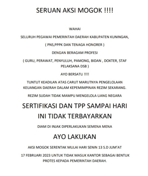 Seperti diketahui, sebelumnya beredar pamflet tanpa kop surat dan tanda tangan siapapun, yang mengajak ASN mogok kerja pada Senin – Jumat (13-17/2/2023) mendatang sebagai bentuk protes belum cairnya TPG dan TPP.