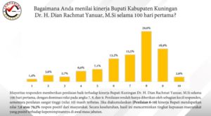 Hasil survey untuk kinerja Bupati Kuningan Dr H Dian Rachmat Yanuar M Si, kategori yang tidak puas hanya sekitar 29 persen. Responden, menilai kinerja Bupati dengan poin 1-10.