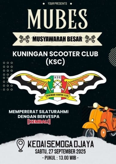 KUNINGAN (MASS) – Setelah lebih dari 10 tahun “tertidur”, komunitas legendaris pecinta Vespa, Kuningan Scooter Club (KSC), kembali bangkit. Melalui gelaran Musyawarah Kuningan Scooter Club (MUBES KSC) 2025 yang berlangsung meriah pada Sabtu (27/9/2025), para petouring sejati berkumpul untuk memilih kepengurusan baru dan mengukir kembali sejarah klub yang lahir pada tahun 2004 ini.