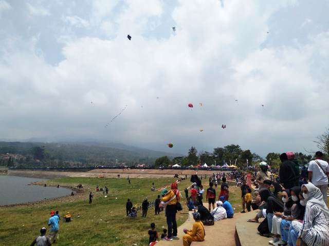 Pengunjung Festival Waduk Darma lebih memilih menonton layang-layang hias. Mereka rela panas-panasanya melihat lomba yang jarang digelar di Kuningan itu.