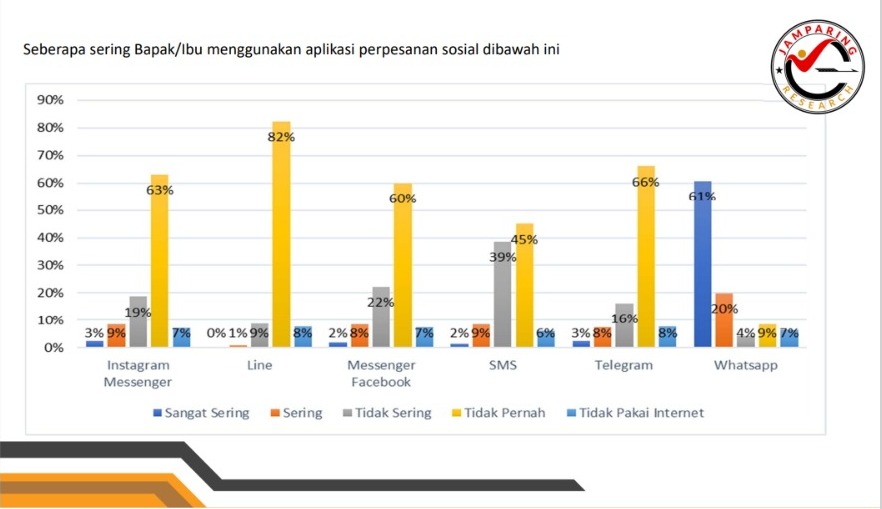 Terakhir, yang disurvey adalah aplikasi pesan yang digunakan warga Kuningan. Dalam survey itu, WhatsApp jadi penguasanya. Bahkan, keterhubungan warga Kuningannya lebih dari 80%.