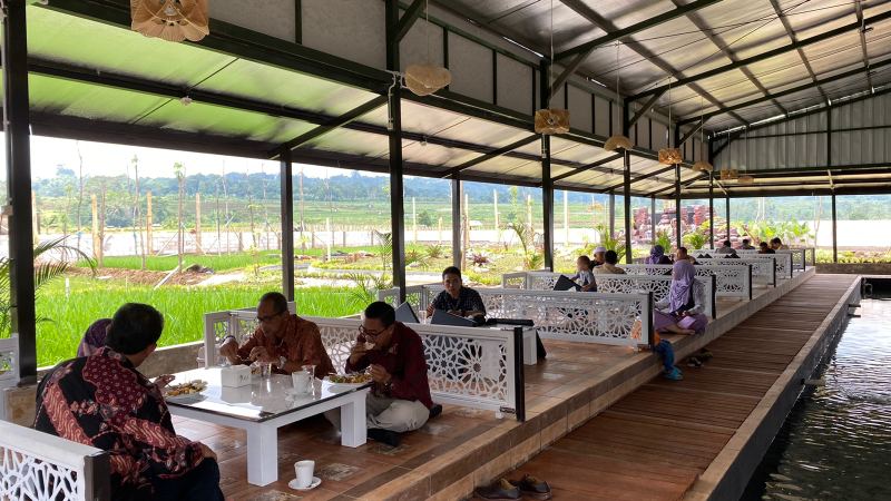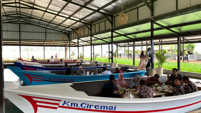 Belum lagi di area belakang yang disulap jadi sangat nyaman dan menyenangkan dengan pemandangan sawah serta Gunung Ciremai. Dan yang paling wajib dicoba adalah sensasi menyantap hidangan di atas perahu.