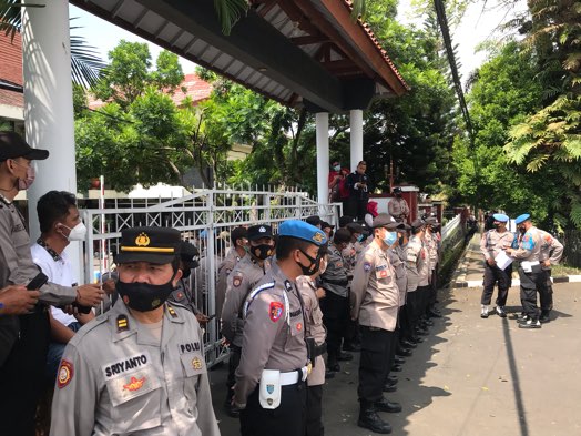 Selain aparat kepolisian, terlihat juga unsur Satpol PP dan TNI. Bahkan, mobil penyemprot air Damkar pun sudah terlihat bersiaga di dalam.