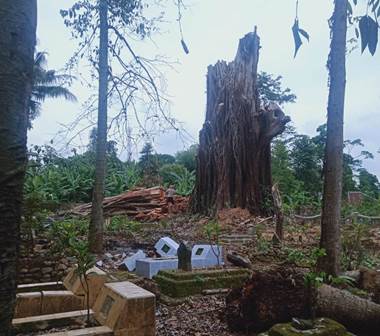 KUNINGAN (MASS) – Penebangan pohon besar di lingkungan Astana Depok RT 003 RW 002 Dusun 2 Desa Panawuan Kecamatan Cigandamekar, berdampak bahkan pada makam yang ada di sekitar. Beberapa, bahkan rusak.
