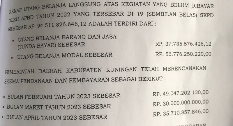Sebelumnya, yang terungkap ke permukaan sebagai hutang Tunda Bayar sebesar 94,5 Milyar, hanya meliputi Belanja Langsung (LS) utang belanja barang dan jasa 37,7 Milyar, dan utang belanja modal sebesar 56,7 Milyar.