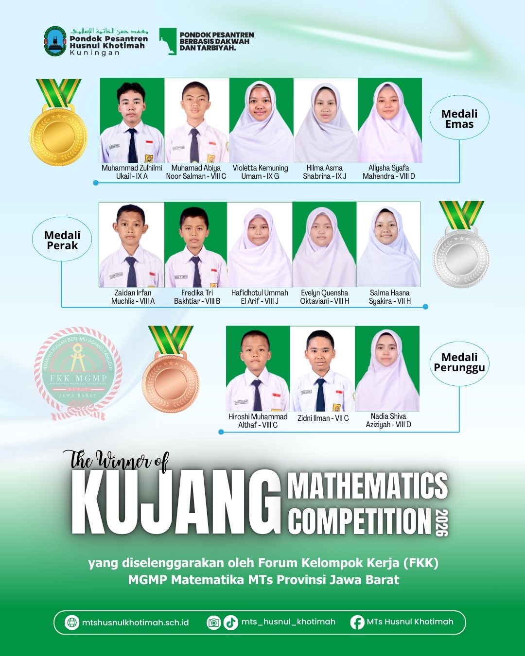 Dalam ajang Kujang Mathematics Competition 2026 se-Jawa Barat, tim matematika Husnul Khotimah sukses memborong medali dengan prestasi yang luar biasa:
