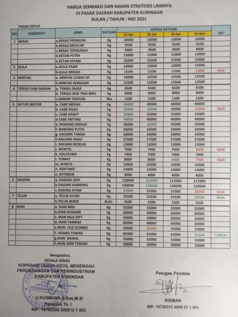 KUNINGAN (MASS) – Harga komoditas cabai dan bawang terpantau mengalami penurunan hari ini, Kamis (30/5/2024). Selain komoditas cabai dan bawang, minyak curah dan telur...