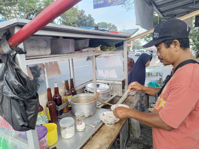 Mie ayam goceng sendiri buka sejak pukul 09.00 WIB pagi hingga menjelang waktu maghrib. Gerobaknya tepat berada di pinggir jalan, dekat gerbang Desa Kaduagung, sebrang terminal Kertawangunan. (eki)